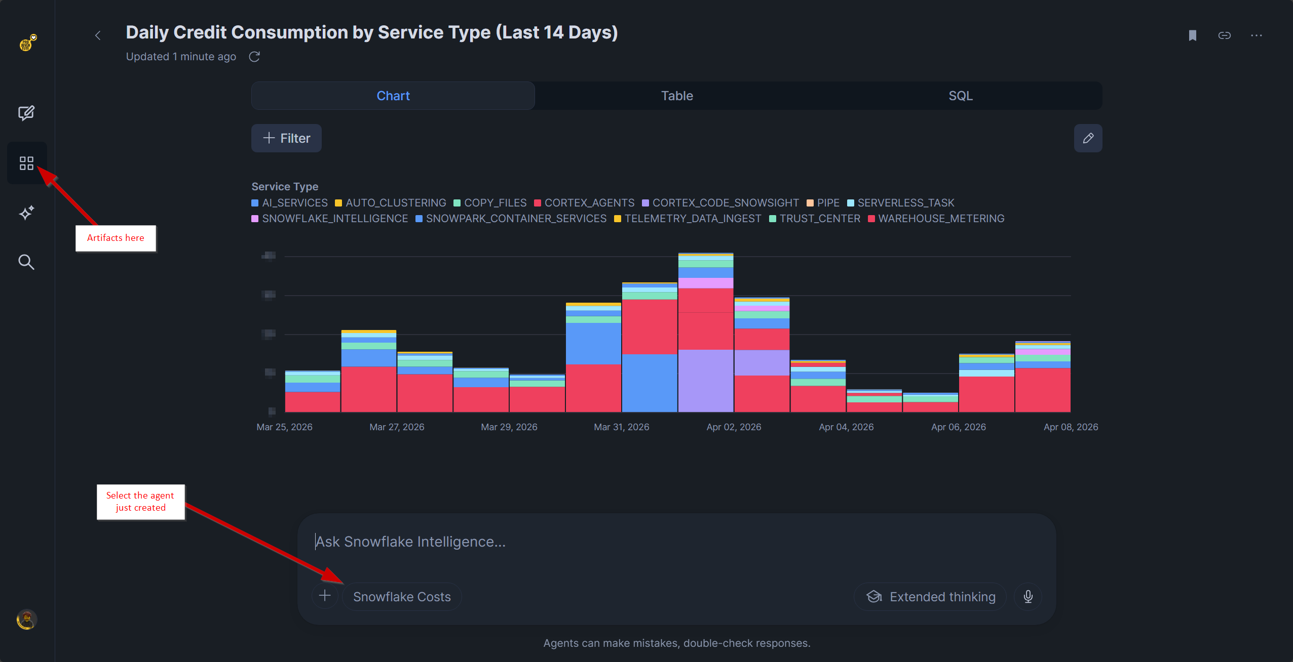 Step 6: Ask a question. Try: "Why did my compute credits increase last month compared to the month before?" The agent will hit the knowledge base, find a matching rule, and generate SQL to decompose the answer by warehouse, service type, and time period.